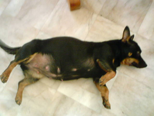 Ojoj, det är verkligen inte långt kvar innan hon balanserar på magen 🙂 Ska bli spännande att se hur många det blir. Får man döpa en valp om man gissar rätt på antal och könsfördelning?