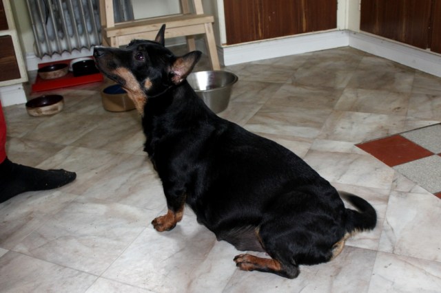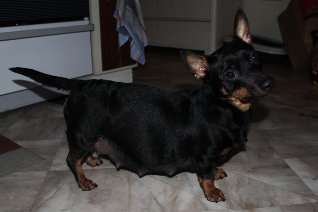 Magen är ju verkligen brutalt stor! Det ser knappt ut som att huvet hör till kroppen det sitter på 😛 Skönt för lilla Ronja att hon inte behöver bära den så länge till iallafall och hon får lycka till med valpningen! Jag håller tummarna för henne att allt går bra och att det blir 5 små valpar =)
