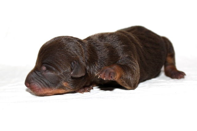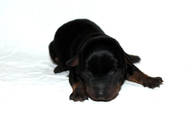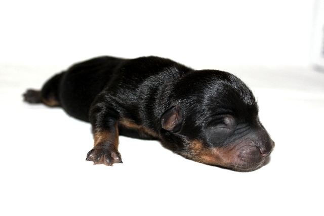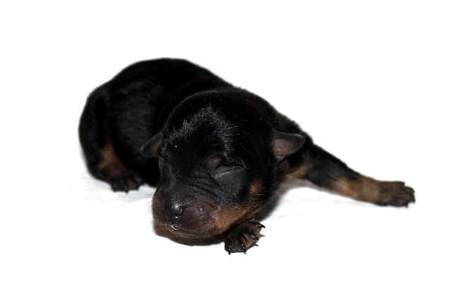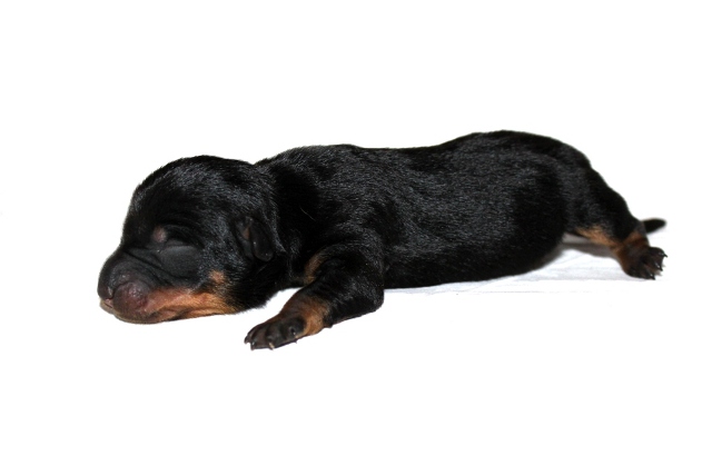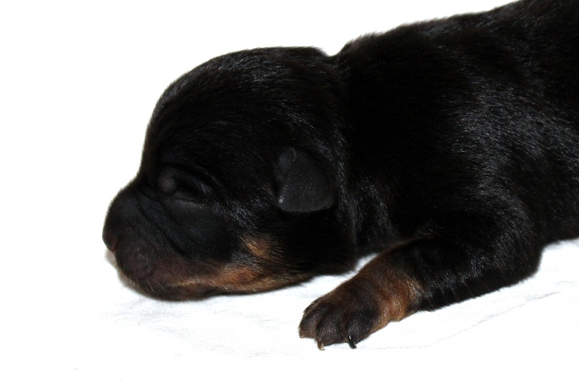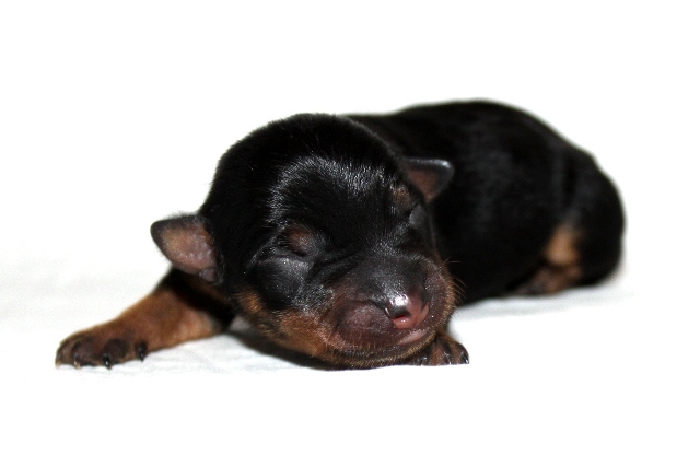 När den fjärde tiken kom blev vi allt förvånade, hur många tikar kan man få i en kull tänkte vi! På sina 220 gram började vi leta efter något att se skillnad från den första valpen, och se då hittade vi en liten vit fläck på bröstet.