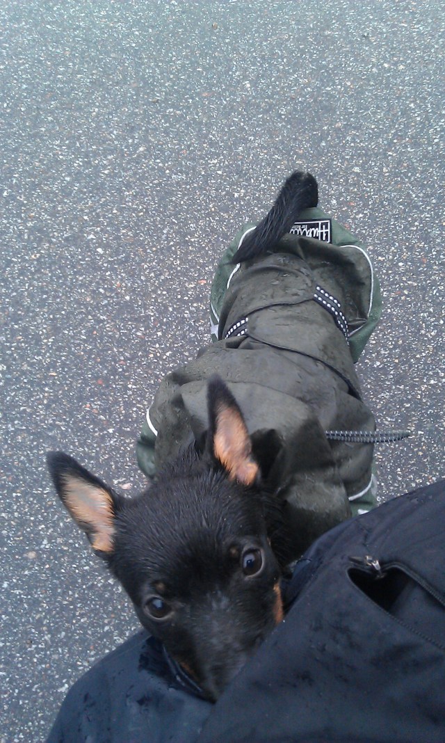 Idag har jag gjort den första seriösa ensamhetsträningen på henne. Först var vi ute och promenerade i regnet så hon skulle bli riktigt trött. Tyvärr såg aldrig regnet ut att sluta så vi var tvungen att välja det. Hon fick låna Ronjas regnjacka för att inte bli kall så fort och det hade hon inget emot (förutom påtagningen däremot eftersom hon främst trodde att det var en kampleksak). När vi kom in var hela kroppen och låren torra så den hjälpte verkligen! Lite stor däremot men känns onödigt att köpa en som hon växer ut på en månad, och lite regn dör man ju inte annars av bara man inte är ute för länge.