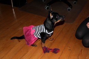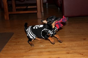 Jag brukar inte klä på min hund kläder om de inte fyller någon funktion, men när jag nu fick dessa från en bekant som varit i USA var jag ju tvungen att introducera dem till Tuva. Mitt motto är att så länge inte hunden märker av det så spelar det ju heller ingen roll – Och är hon inte charmig i sin nya outfit? 😉
