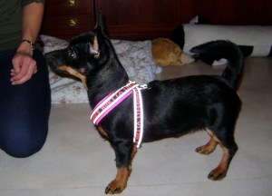 Sedan har hon även fått den här selen som är en annan modell till när hon ska spåra – för att göra det lättare att skilja mellan spårarbete och vardag. Size 0 (?) och cirka 129 kr.