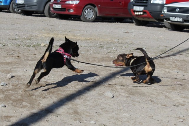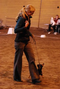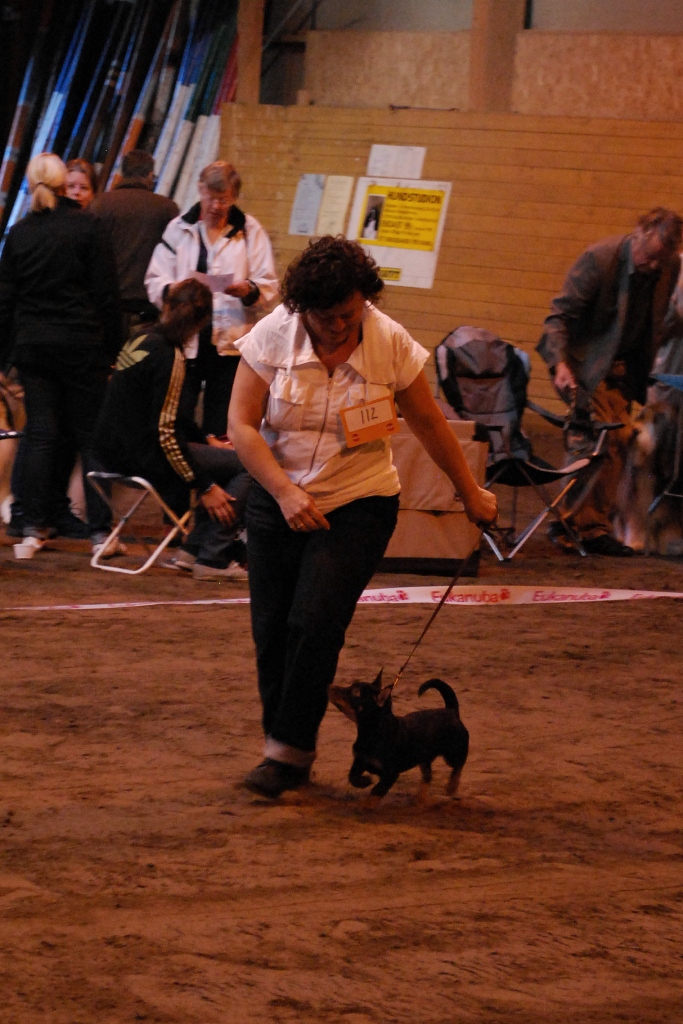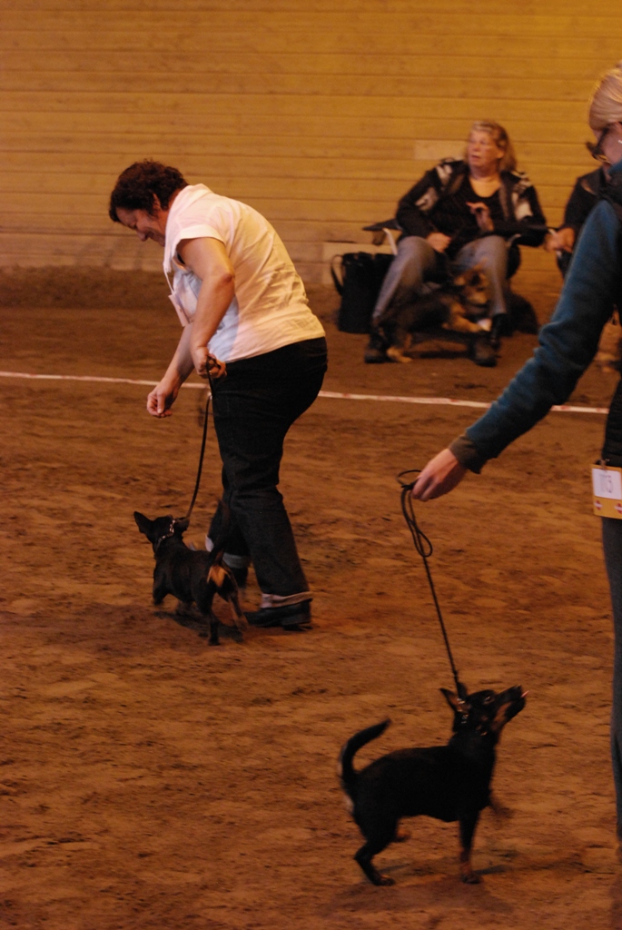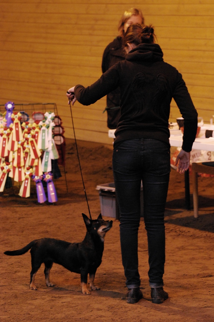 Det var tre heeler anmälda till utställningen, i valpklass 4 -6 mån var det dessa två små damer och i öppenklass var Vila anmäld. När det var tur för valpklassen att gå in i ringen så fick nog flertalet åskådare sig ett gott skratt. Glada var de små heelrarna, speciellt när de kände sanden i ridhuset under tassarna och en så busig kompis i ringen samtidigt! Glatt sprätte de runt där med bara delvid kontakt med föraren – men det var ju samtidigt även målet för den här utställningen – att ha roligt och miljöträna.