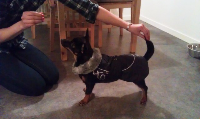 Det var tvungen för att firas med ett inköp av Hurttas vintertäcke, svart i stlk 36. Tuva växer som tusan och hade vuxit ur sitt gamla. Täcket behöver vi inte använda när vi är ute och går, men när vi åker till bruksan och det blir en del passivitet så blir det nog så kallt när hon sitter still.