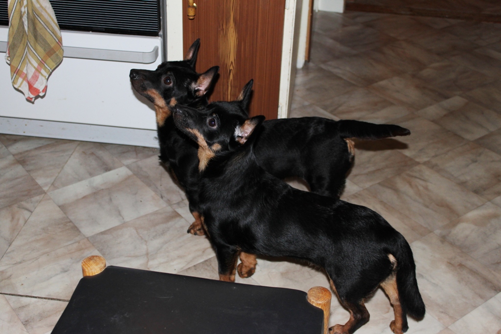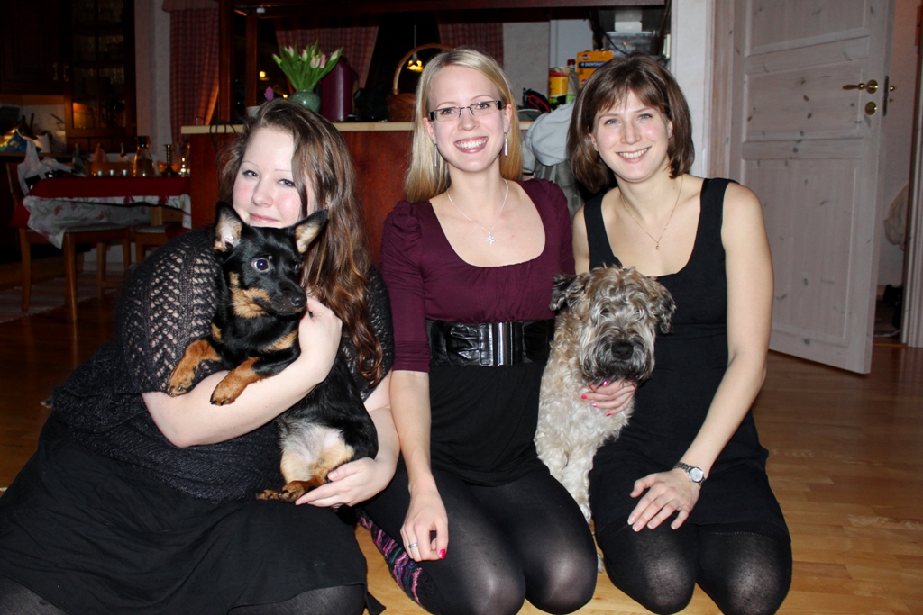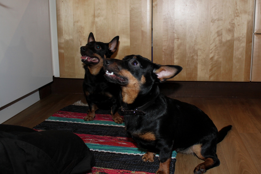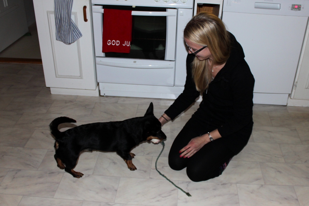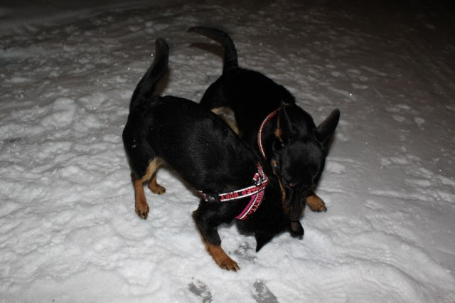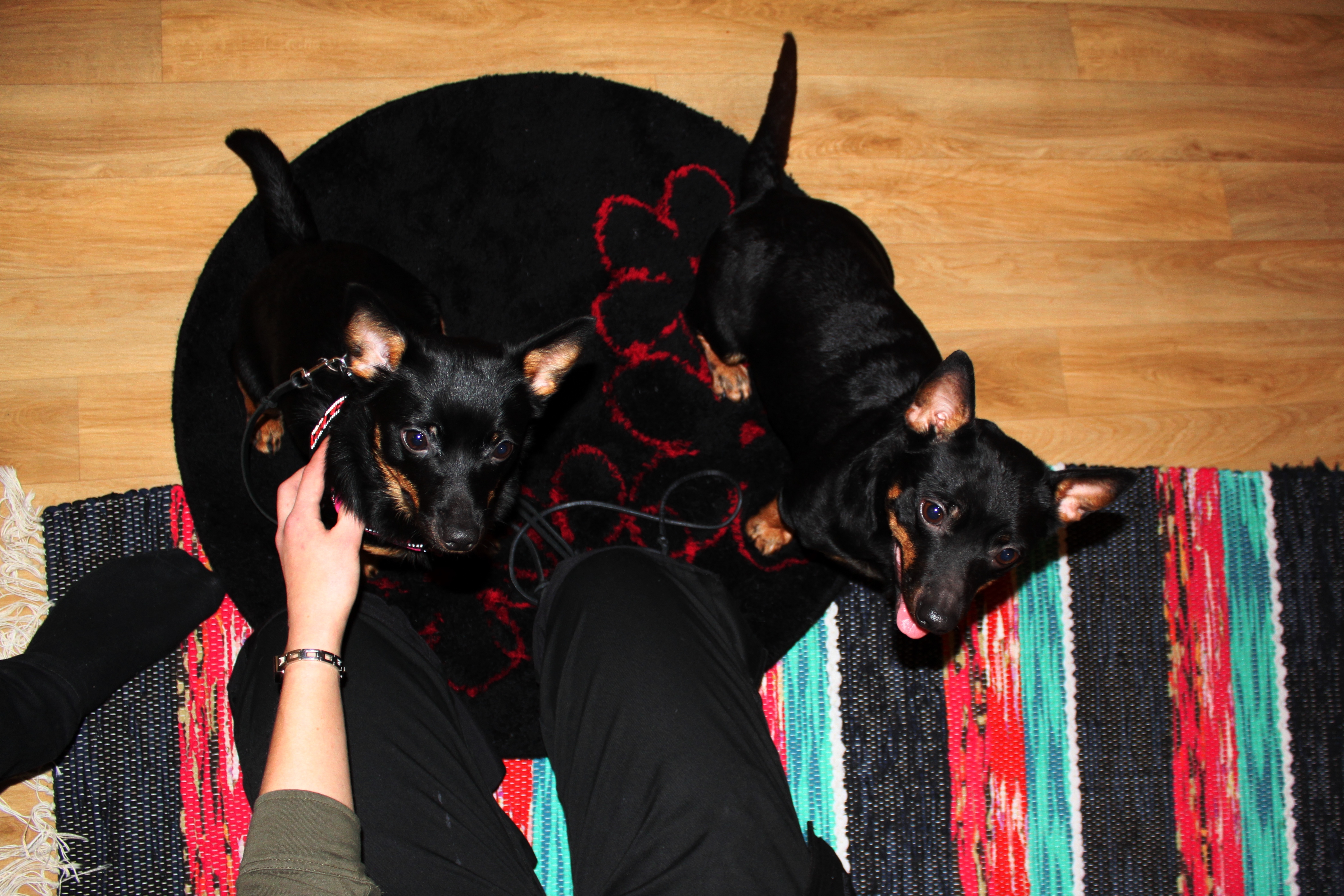 Iår blev det inget långt besök i norrland, men under några knappa dagar hann vi trots det hälsa på både familj, vänner och några av valpköparna. Det blev även ett mycket kärt återseende med fina Ronja som såg mycket välmående ut! Tuva blev hysteriskt glad över att få träffa sin mor igen och paddlade runt på golvet som en riktig bäbis(!). Lite kul att se eftersom Tuva ändå brukar visa ganska lugn undergivenhet när hon hälsar på äldre hundar. Men nu minsann, ålade hon efter golvet och slickade hejvilt i mungipan. Ronja tog det hela med ro och var lite lugnt avvisande tills Tuva lugnat sig lite. Efter den här proceduren lekte de på riktigt bra och jag tror att även Ronja tyckte det var kul att återse lilla svarta. När leken lugnat sig svansade Tuva efter Ronja och härmade allt stora damen gjorde, man kan ju lära sig både det ena och det andra tyckte Tuva 😉