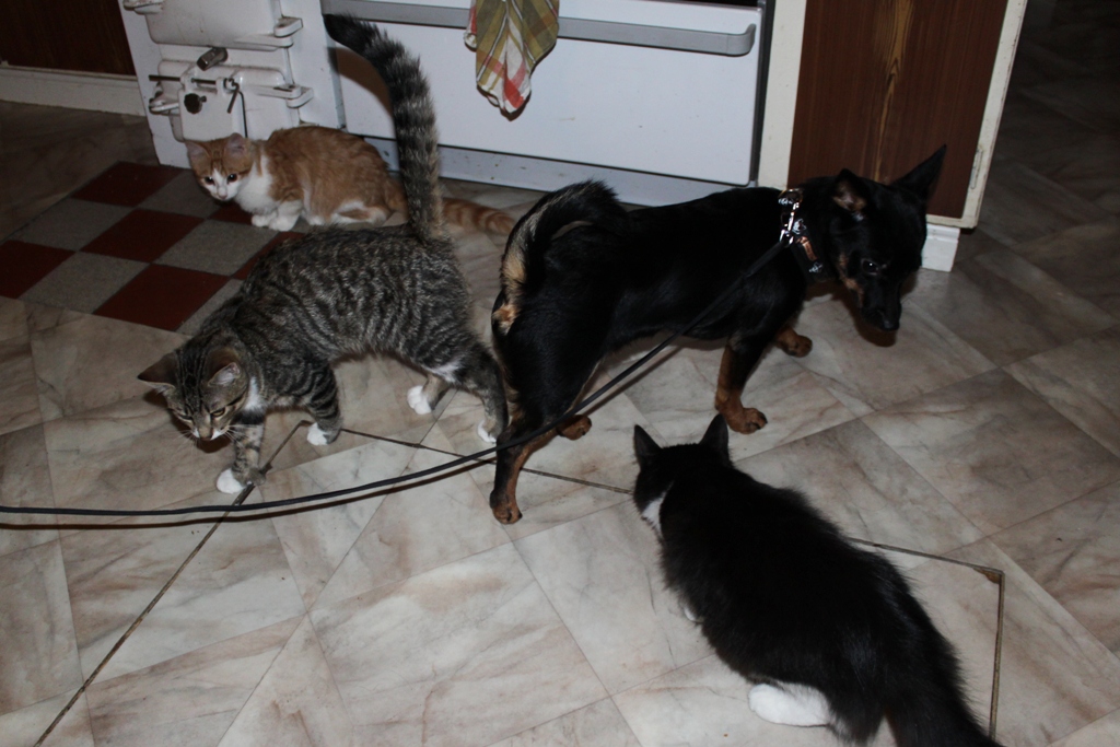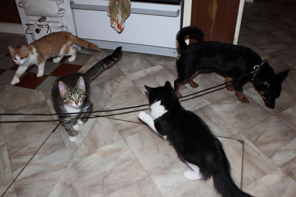 Tuva fick även träffa kattungarna som väntar på att flytta till sina nya hem. Även om nu kattungarna inte var så brydda i hunden, så var de desto mer instresserade i den där intressanta linan.