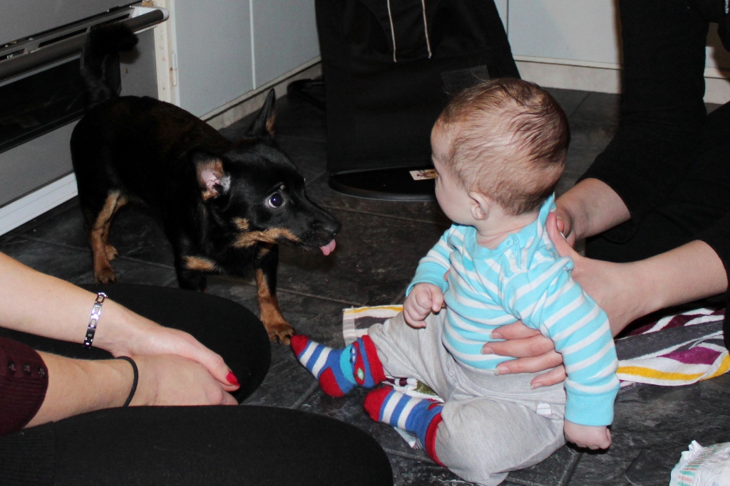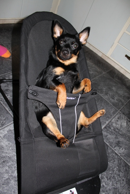jag har dessutom gått och blivit moster också till världens finaste lilla pojke! Den var tvungen att undersökas tyckte Tuva, och hon fann naturligtvis att det absolut bästa bytet man kunde hitta var kissblöjor! Mmmh, tänk att lyckas stjäla en sån! (Detta var naturligtvis mindre uppskattat av mig). Däremot var det kul att se hur bra de två kom överens, de kommer säkerligen hitta på flertalet hyss tillsammans i framtiden…