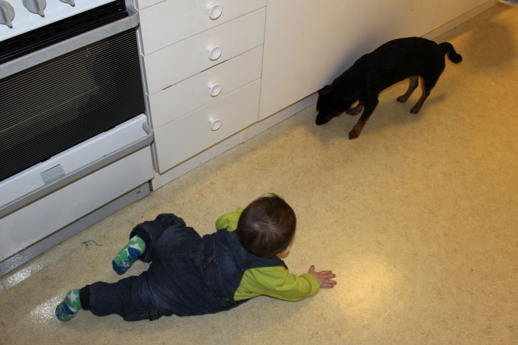 Här är en bild när Tuva hälsade på lilla Loke. Tuva letar smulor och Loke letar Tuva, de vet verkligen hur man drar nytta av varandra 😉