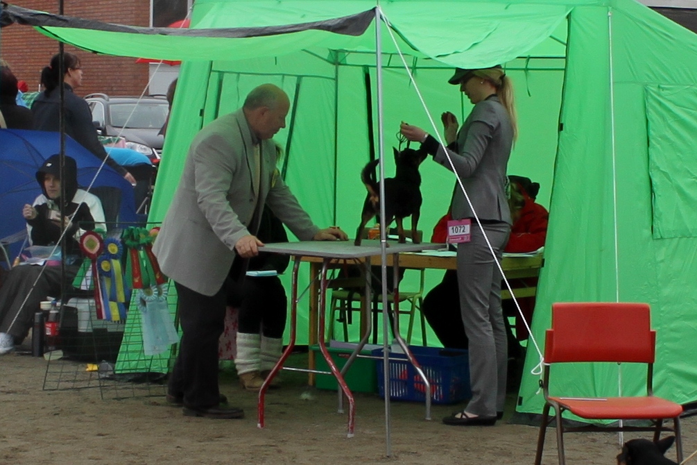 När vi kom till öppenklassen var det Ronjas tur att exteriörbedömas. Domaren, Andras Polgar, var mycket förtjust i henne och dagen slutade för henne med excellent, ck och reserv-cert! Nära sitt svenska utställningschampionat, kan man nu säga att hon har två och ett halvt cert? 😉
