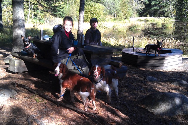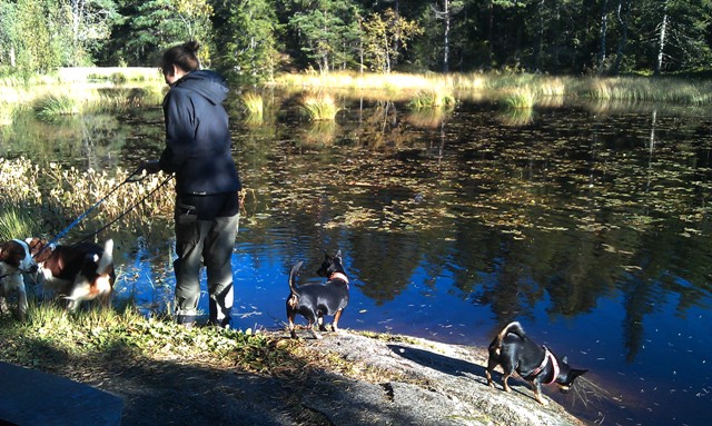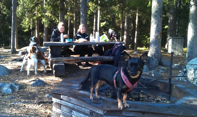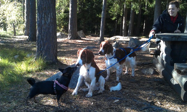 Vi satte oss och fikade brevid ett vattendrag efter uppletandet. Det var väldigt vackert på platsen, och gott sällskap. Tuva minglade omkring med de andra hundarna, letade godis i vattnet och var sugen på att jaga en anka (men då måste man ju simma!) och såg väldigt nöjd ut.
