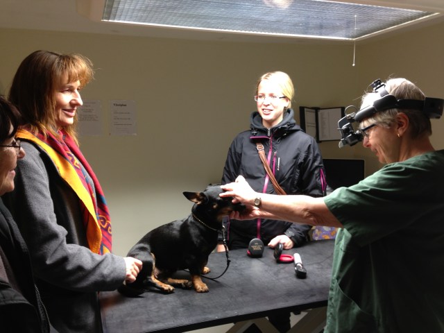 Idag har Ronja fått följa på invigningen av XL Vets mottagning i Tierp. Besöket bjöd på tipspromenad, fika och möjlighet att träffa de som arbetar på kliniken. Eva Hertil var där och demonstrerade ögonlysning och Ronja ställde gärna upp som modellhund. Goda nyheter är att Ronja fortfarande har friska ögon! Genom att kika i en spegel som fanns på instrumentet så fick vi som åskådare möjlighet att se samma som veterinären ser inne i hundens öga.