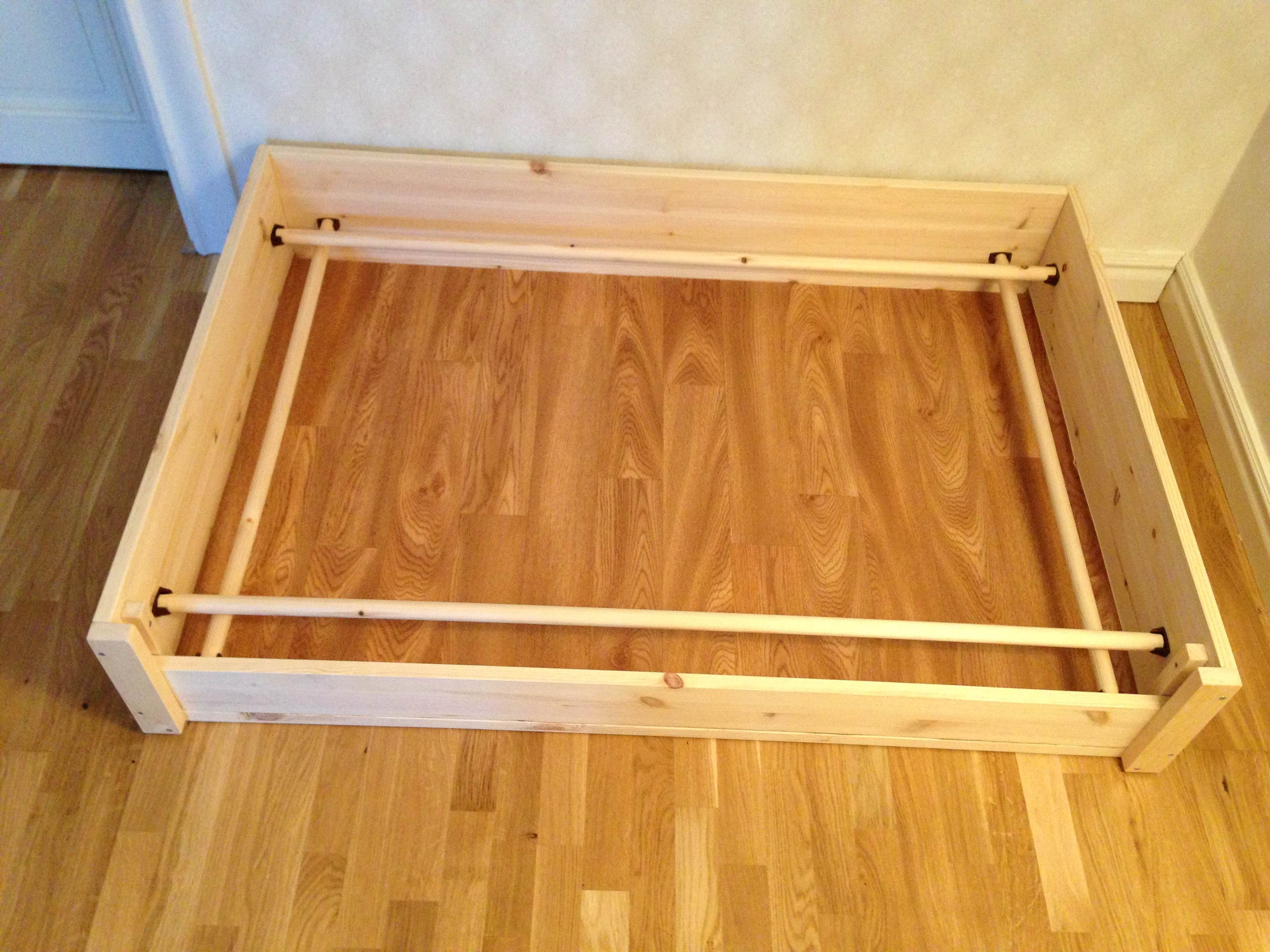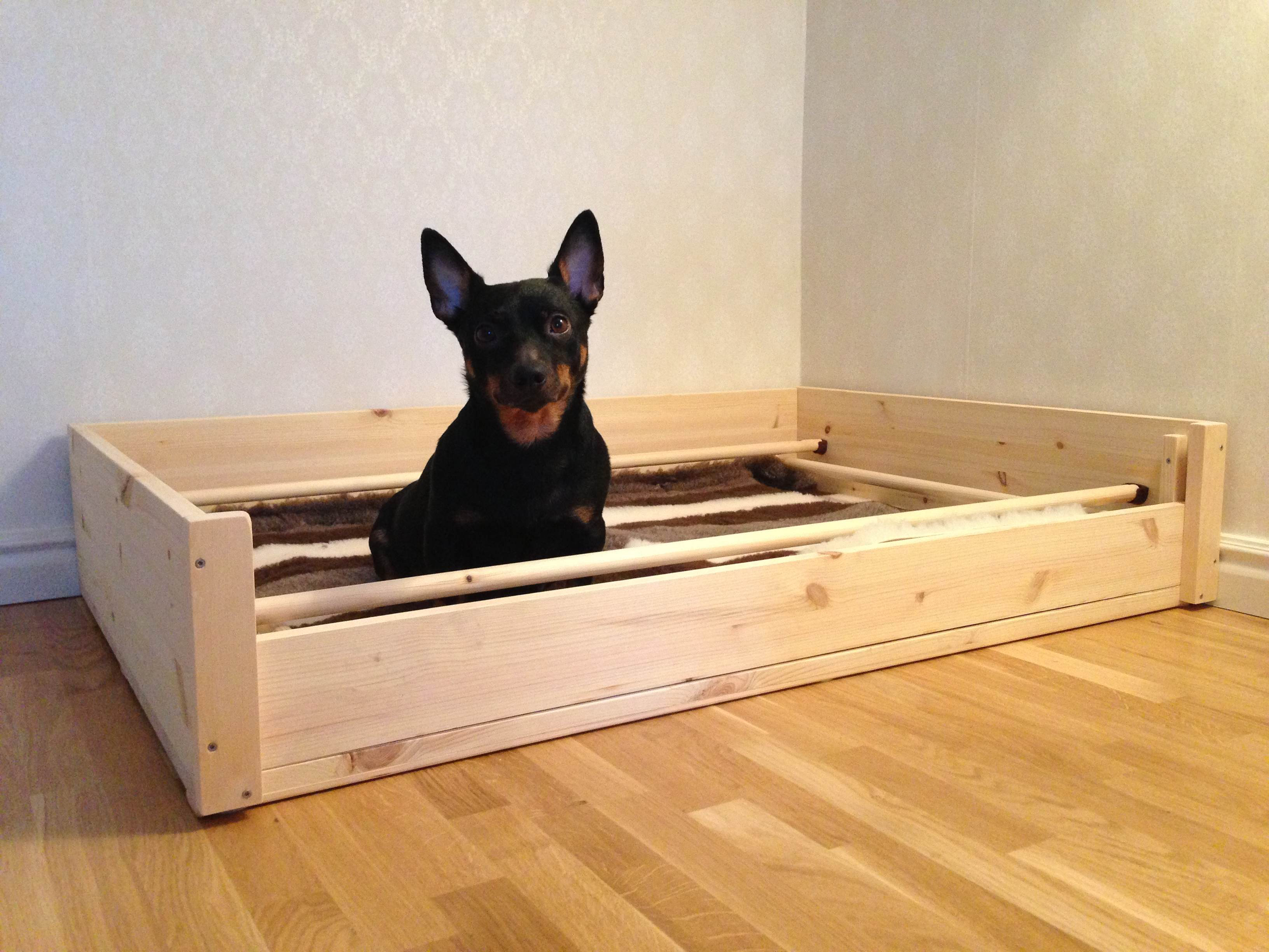 På insidorna har vi satt upp trästavar som skydd för att tiken inte ska råka klämma valparna mellan henne och väggen när de är riktigt små. Eftersom de är avtagbara kan man ta bort skyddet när risken är borta vid någon vecka. Sist men inte minst så har vi lagt en linoleummatta i botten för att göra lådan avtorkningsbar.
