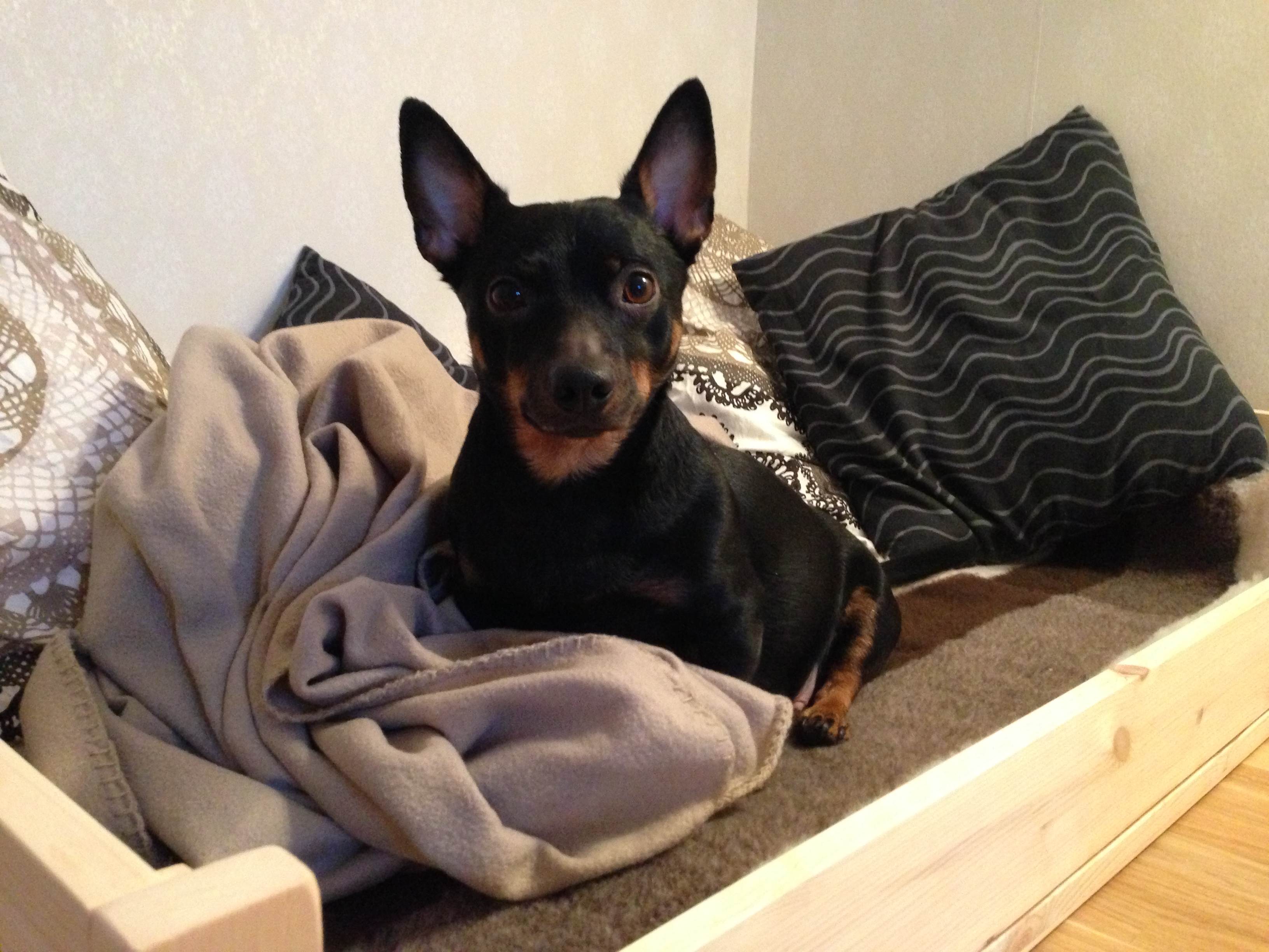 För Ronjas del så pimpade vi upp valplådan med kuddarna som hon redan bäddat i soffan med och en ny hundfäll som vi köpte på utställningen. Det är för att jag räknar med en hel del ”bäddande” och vill få henna att känna sig hemmastadd. Det vart rätt lyckat – hon ville inte lämna rummet den dagen och jag tror hon förstod rätt fort vart valparna ska läggas 😉
