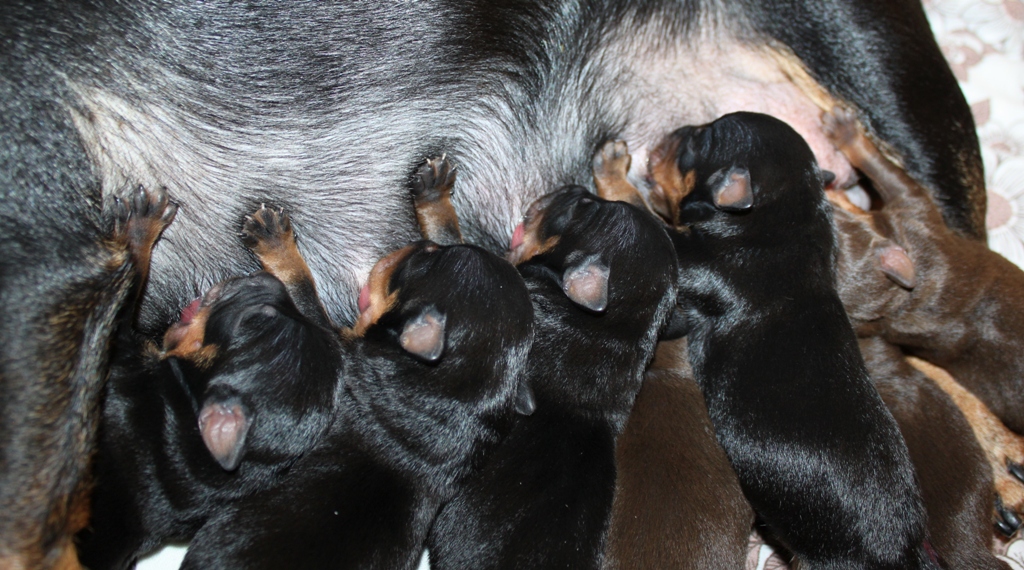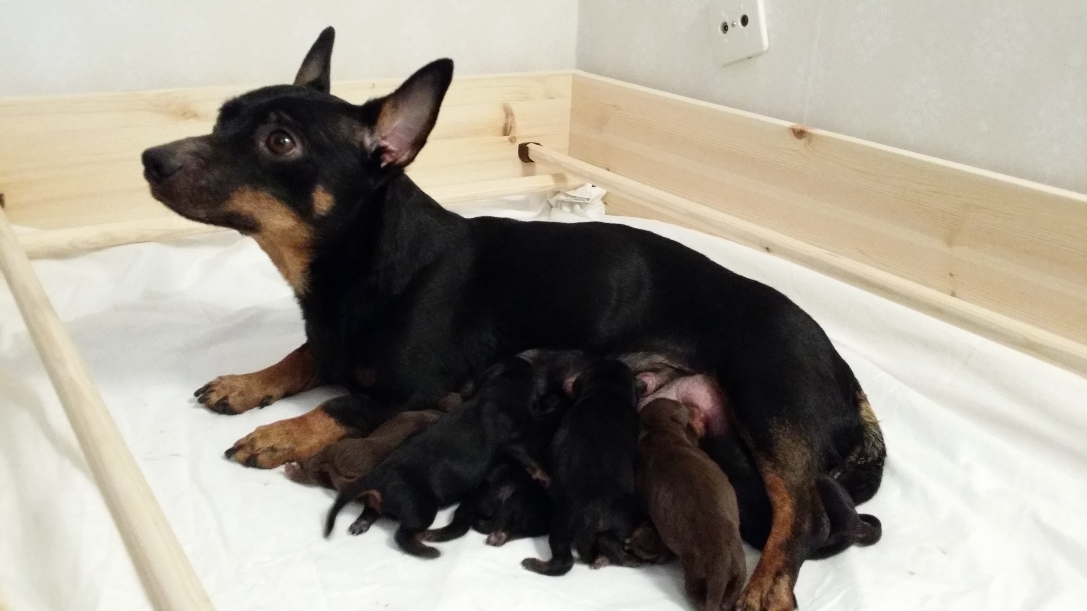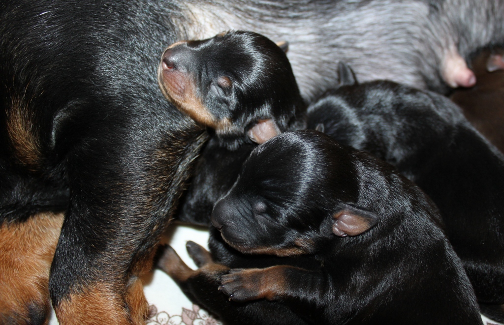 Först till världen kom en black & tan hane på 200 gram. Han var ivrigt fram och diade så man blev nästan orolig att inte mjölken skulle räcka till syskonen om han fortsatte sådär 😉 Född med baksporrar.