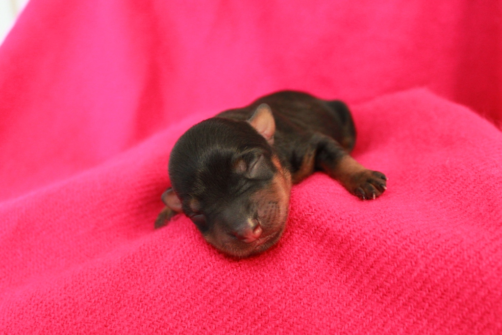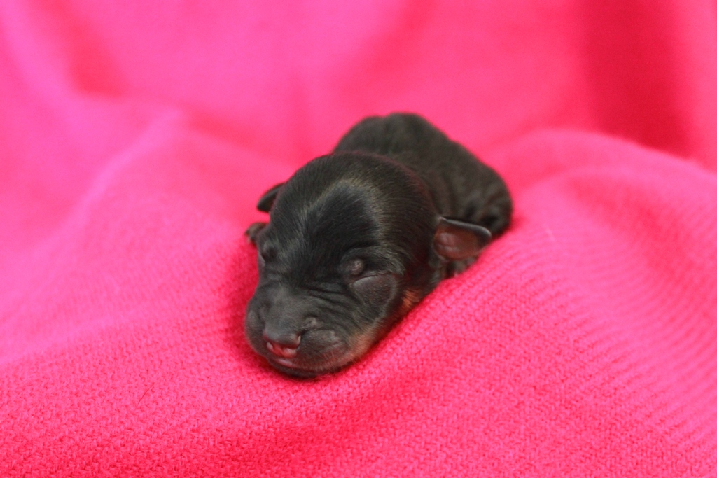 Som fjärde valp kom en grann black & tan tik på 225 gram. Hon har en liten vit strimma på bröstet och fina färger i teckningen. När vi fotade dagen efter så sov hon gärna i fotografens famn!