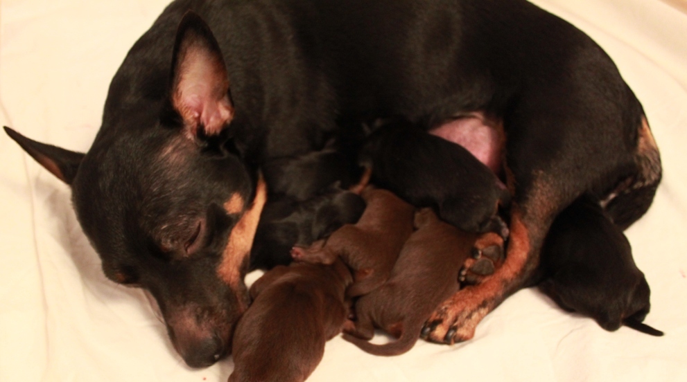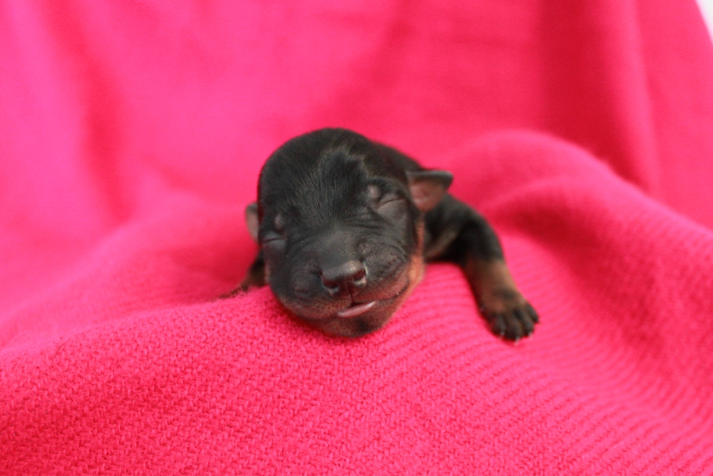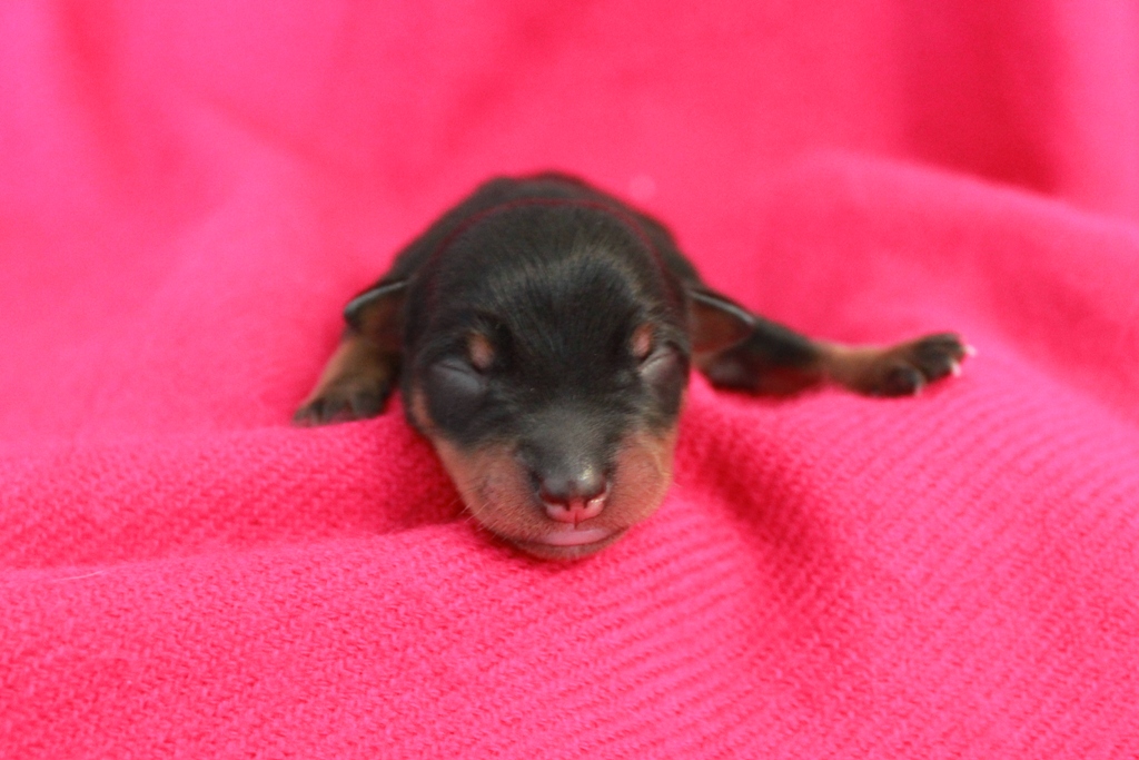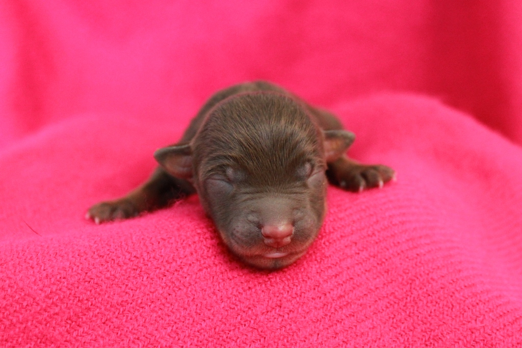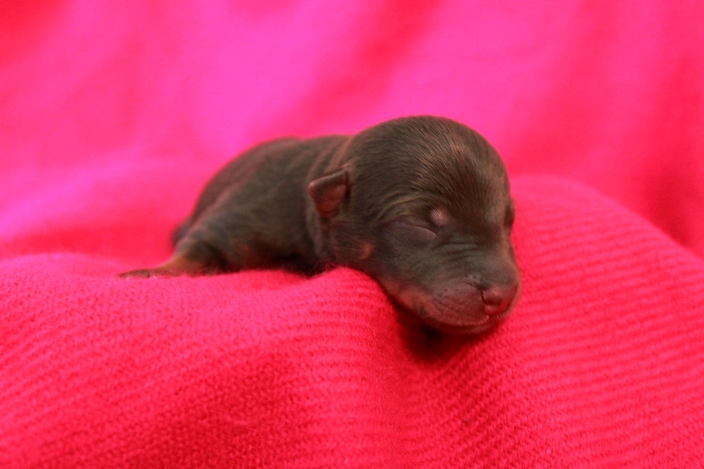 Som andra valp kom en liver & tan tik på 215 gram. Riktigt glad blev jag då eftersom jag gärna vill åtminstone ha en tik som jag kan ta vidare i avel om kullen faller sig bra! Född med baksporrar.