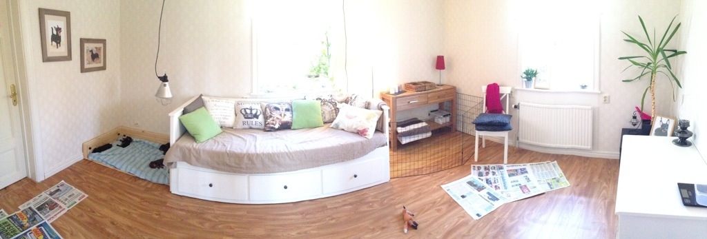 Tänkte skriva och berätta att Valparnas veckouppdatering kommer imorgonkväll istället. Vi har tyvärr inte hunnit sitta vid datorn under helgen. Skickar med en bild över hur valprummet nu ser ut när de fått tillgång till hela, deras upptäcktsfärder blir bara längre och längre och de äter redan två gånger om dagen 🙂 Skriver mer imorgon! Go natt!