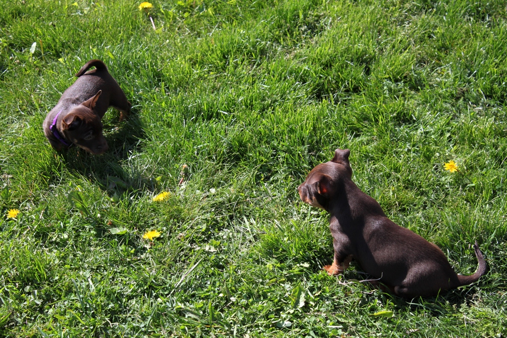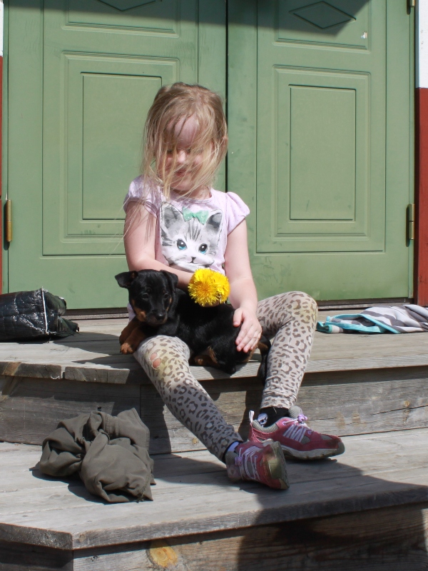 Valparna är fort och entusiastiskt fram när vi har besökare och somnar sedan gott efter en stunds lek medan besökarna är kvar. De håller sig kring oss när vi är i trädgården och älskar upptäcktsresorna som vi gör kring gården, det är väldigt skönt med så stor yta. Sommaren har äntligen gjort sitt inträde, så vi har kunnat vara ute hela helgen.