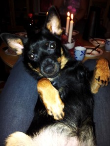 Iår blev det inget långt besök i norrland, men under några knappa dagar hann vi trots det hälsa på både familj, vänner och några av valpköparna. Det blev även ett mycket kärt återseende med fina Ronja som såg mycket välmående ut! Tuva blev hysteriskt glad över att få träffa sin mor igen och paddlade runt på golvet som en riktig bäbis(!). Lite kul att se eftersom Tuva ändå brukar visa ganska lugn undergivenhet när hon hälsar på äldre hundar. Men nu minsann, ålade hon efter golvet och slickade hejvilt i mungipan. Ronja tog det hela med ro och var lite lugnt avvisande tills Tuva lugnat sig lite. Efter den här proceduren lekte de på riktigt bra och jag tror att även Ronja tyckte det var kul att återse lilla svarta. När leken lugnat sig svansade Tuva efter Ronja och härmade allt stora damen gjorde, man kan ju lära sig både det ena och det andra tyckte Tuva 😉