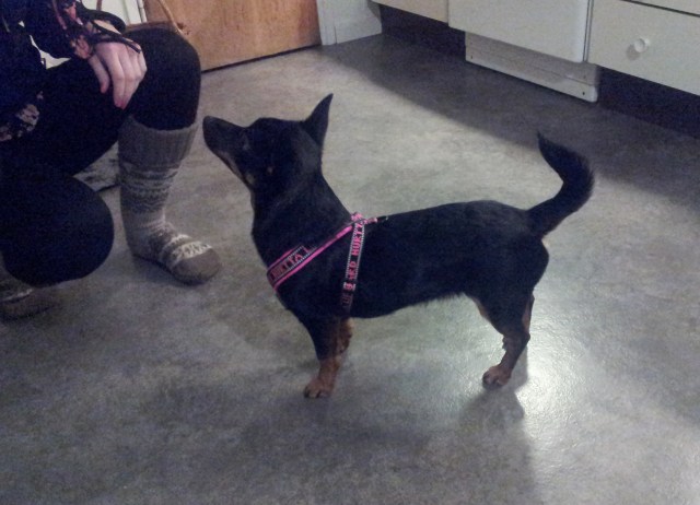 Tuva fick även träffa kattungarna som väntar på att flytta till sina nya hem. Även om nu kattungarna inte var så brydda i hunden, så var de desto mer instresserade i den där intressanta linan.