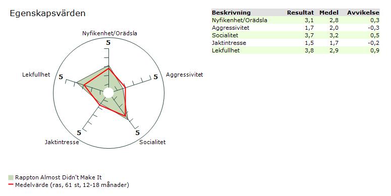 Ronja är en trygg och stabil hund som är glad och öppen mot främmande människor och hundar. Hon tycker mycket om att vara med och hon har en vilja att gå fram och undersöka nya saker och föremål och avreagerar lätt.