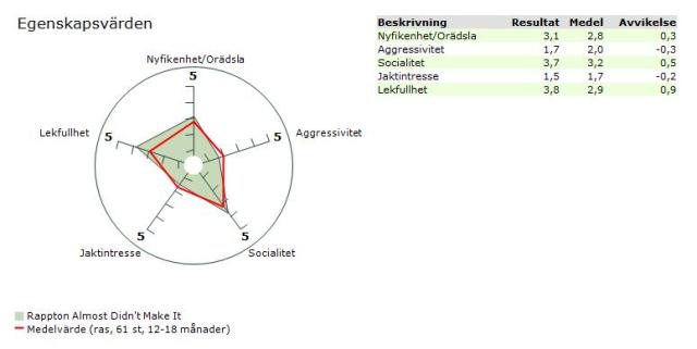 Ronja genomförde en mentalbeskrivning inom SKK och fick ett resultat på MHt som jag är väldigt nöjd med. Hon är tillgänglig och svarar med gott kontaktbeteende och leker bra med testledaren, hon avreagerar bra och har inga kvarståenda rädslor, så jag är väldigt nöjd! Med MHt genomfört räknas det nu som att hon har känd mental status.