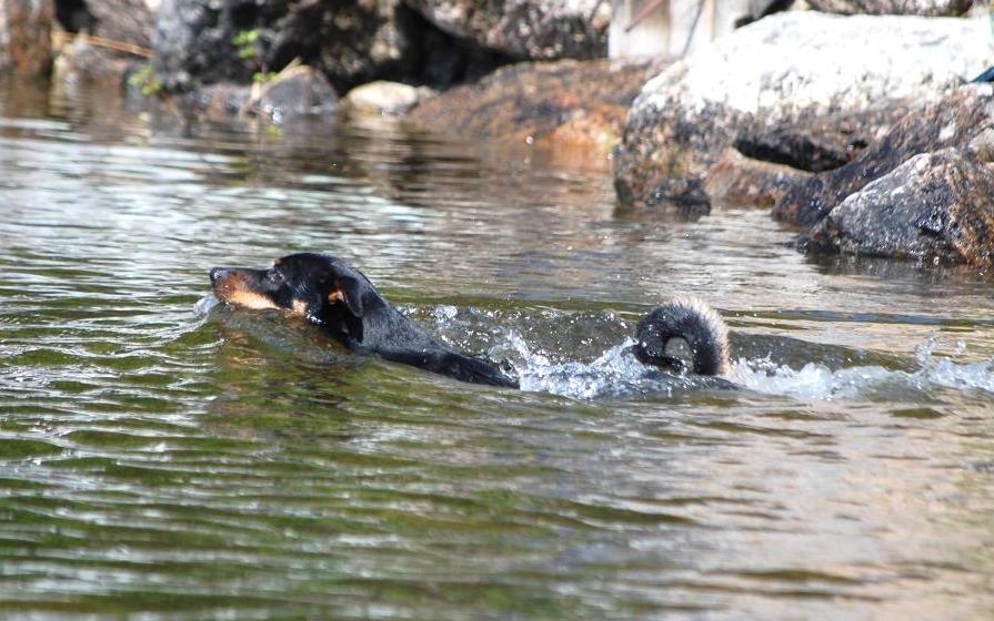 Han är lättlärd och räknar snabbt ut längre beteendekedjor, på både gott och ont ;). Fram tills nu så har han skaffat sig några något udda hobbies: Spåra ovan och längs efter vattenytor och vattendrag, forsränning samt att undersöka och analysera lukter och ljud av alla de slag. Det senare avspeglas i MH:et som en 3:a på skotten, men han har i vardagen inte visat någon rädsla för skott. Lite kuriosa är att vid forsränningen så har Iso utvecklat en teknik där han går/simmar ut till mitten av forsen/ån där strömmen är som starkast, sedan låter han sig tas med av strömmen genom att endast styra med få och lätta simtag när så behövs. När han åkt färdigt strömstället, simmar man motströms och gör om det hela, igen och igen 😉